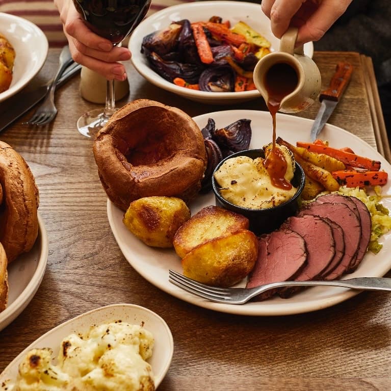 Each plate comes with bottomless trimmings, including unlimited Yorkshire puddings, crisp golden roast potatoes and rich, proper gravy.